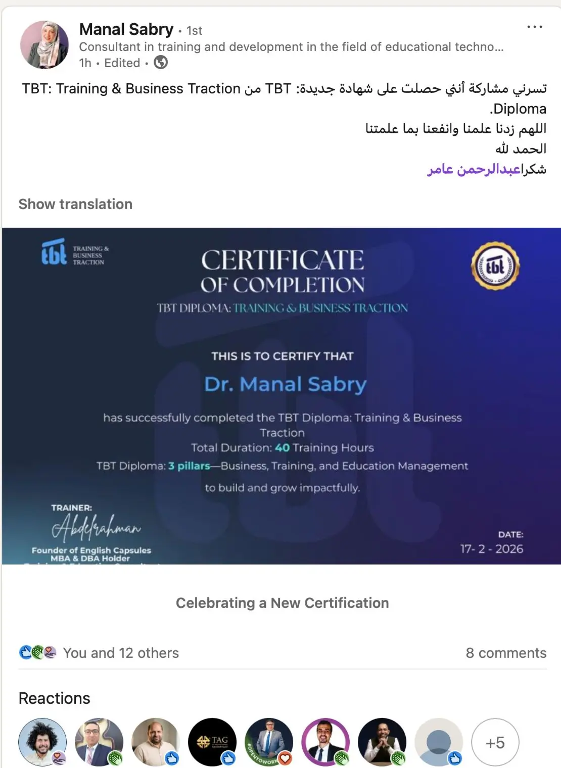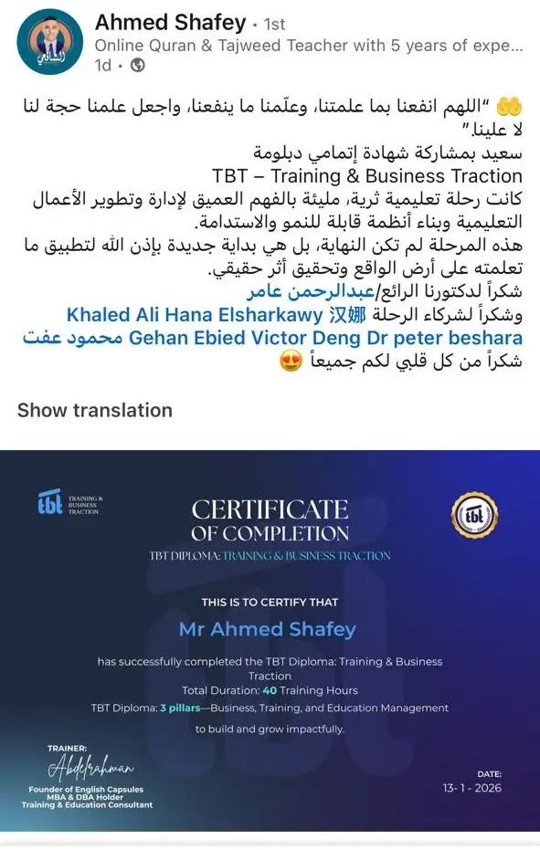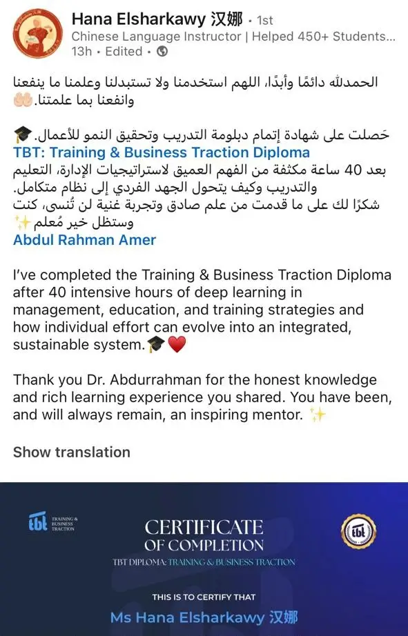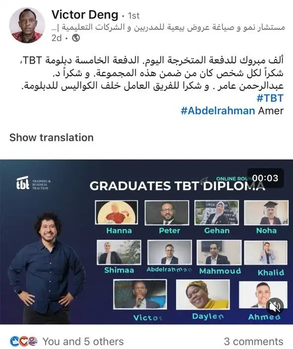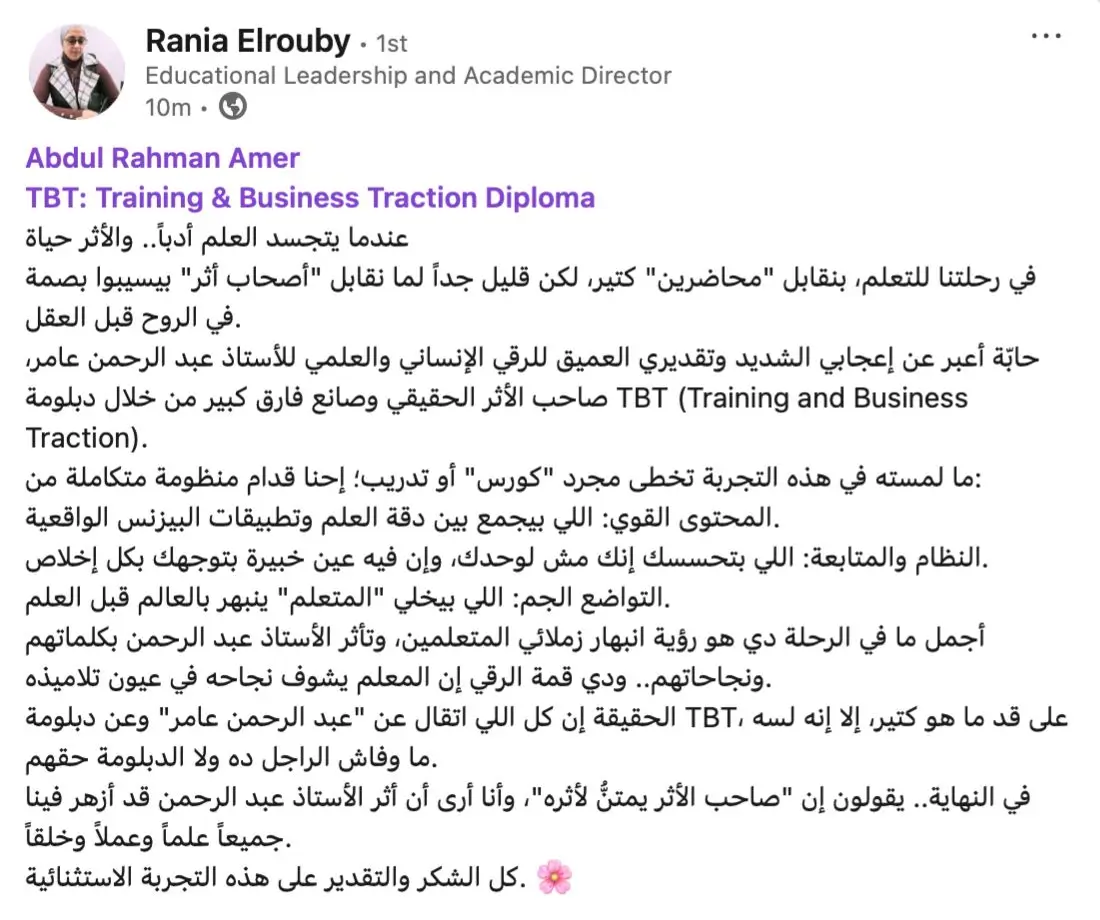 بعد تخرجك من الدبلومة، ستنضم إلى مجموعة خريجي TBT (TBT Alumni Group)، لتصبح جزءًا من شبكة احترافية عالمية تضم مدربين، رواد تعليم، ومديري مؤسسات من مختلف الدول .. شبكة تفتح لك أبواب التعاون، الشراكات، وتبادل الفرص على مستوى عالمي.